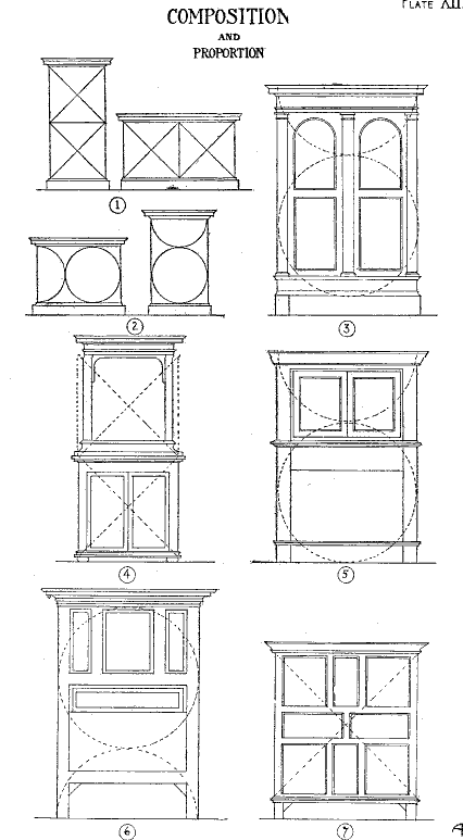 Case FurnitureThe beauty of casework, such as corner cabinets, bookcases, wardrobes, chests of drawers, and desks, is dependent on: Firstly, its proportion as a whole. That is whether the height, the width, and the depth are of dimensions that appear well together. In most problems at least one of these dimensions is fixed by some requirement of utility. The designer is then expected to decide the other two. Secondly, the disposition of the parts (ie. panels, framing, architectural members, such as columns, mouldings, etc.), of which the case is composed has its influence on the design. Whether the panels are large, or small; whether they are arranged in pairs, or grouped in another way; whether the mouldings are heavy or light; etc., are the questions studied. Thirdly: The ornamentation. This is the last point to be considered, because if the general form is bad no amount of decoration, whatever its quality, will make a good piece of furniture. In front elevation casework usually approaches more or less the form of a rectangle and the first condition in its design is to find a method for determining the ratio of the sides of a rectangle most agreeable to the eye. This has already been studied by several writers with at least two solutions. One assumes a square as the starting point and implies that any rectangle having two sides equal to the sides of the square will be well proportioned if the other two sides are not more than twice its length. In other words, a well-formed rectangle is not more than two squares long. See diagram. Another ratio given is that of two to three. Assuming that if the width of the rectangle is two, the length should be three. This ratio, o[f course, is included within the limits of the first method. For the purposes of designing it may be assumed that the rectan gle, whether vertical or horizontal, represents the principle mass of the case. What is technically known as the body. To this may be added at the top the crowning members, and at the bottom the base on which the whole is supported. To the sides may be added the projections of mouldings, columns, brackets, or other decorative features. The relation of the various parts to each other and to the whole should be kept in mind. Often casework consists of an upper and lower section. The lower part must not only be sufficiently strong to support what is above it, but it ought to appear so without seeming heavier than is necessary. The base or feet should be proportioned to the mass above and the crown members, well supported, are to be made large enough to serve as a finish for the case without apparently crushing it. The spacing and arranging of the principal lines dividing the case into panels, drawers, etc., is to be such as will give pleasing results, and there are an infinite number of arrangements possible. The whole mass may be divided into two equal parts by a post the same size as one on each corner of the cabinet, No. 3, in the diagram. This sort of a division has the disadvantage of causing the case to appear as if it were made of two smaller ones placed together, and as if the two parts were balanced on the middle line. It is not considered the best way of doing. A similar composition is one in which the case is divided into three parts with the middle one the smallest. This has the faults of the former method though not in such a marked degree. When three divisions are made the best appearance is obtained by making the middle one larger than those each side of it. See No. 6 in the diagram. Other arrangements are also shown on this same plate. As was mentioned above, furniture should be adapted to its use, and if possible its design should indicate the use. The location of an article in a room has its effect on the appearance. So much so, that if possible the designer should study the surroundings. He is then in a position to make a design that will harmonize with the decoration of the room, and an article of a size best suited to the space it will occupy. He can also see how much light will fall on it and be governed somewhat by this in determining the size of the mouldings, etc. If the room is well lighted a moulded member if fine and delicate will show to advantage but in a dark corner larger moulding will be more suitable. Learn more about the building and design of each of the parts that make up case furniture: |